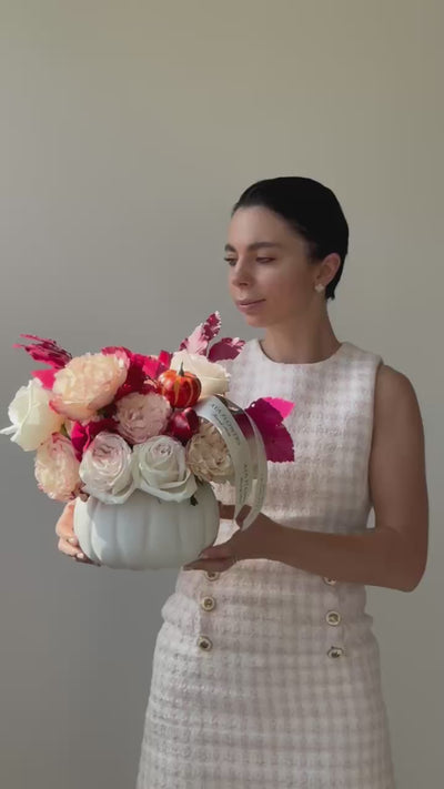 An elegant fall arrangement featuring lush garden roses, seasonal preserved autumn leaves, and hand-picked fall décor accents. Designed in a ceramic pumpkin vase, this piece brings warmth, charm, and a touch of harvest elegance into any home.