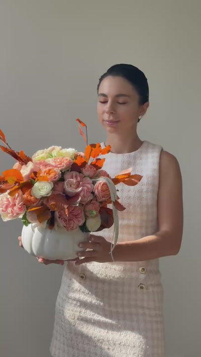 A beautiful fall mix of garden roses, spray roses, and seasonal leaves, artfully arranged in a white ceramic pumpkin vase. This piece brings warmth, coziness, and a touch of sophisticated autumn charm to any home.