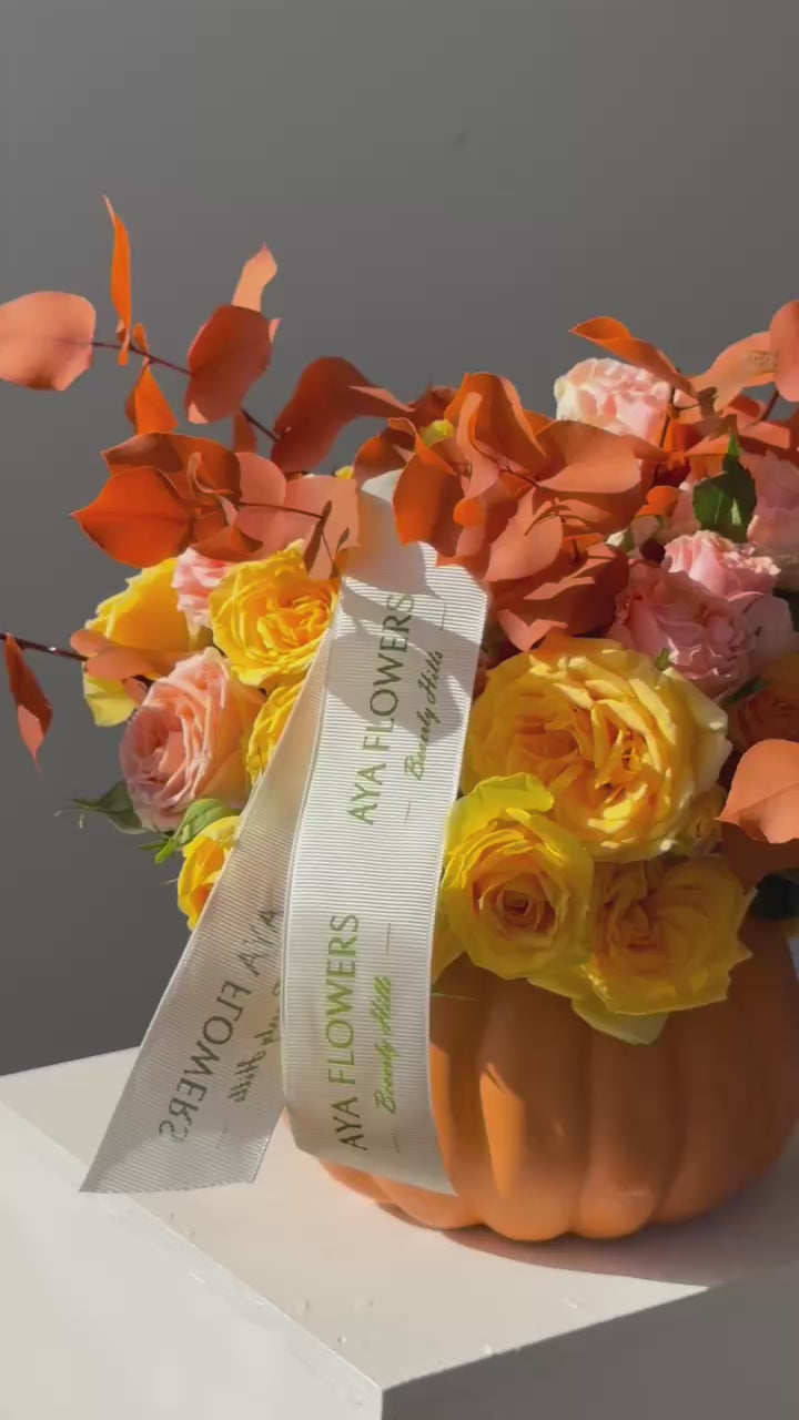 A cozy fall arrangement featuring spray roses in warm autumn shades—soft orange and sunny yellow—paired with preserved seasonal leaves, beautifully arranged in an orange ceramic pumpkin vase. This composition brings the vibrant colors and warmth of autumn into any home.