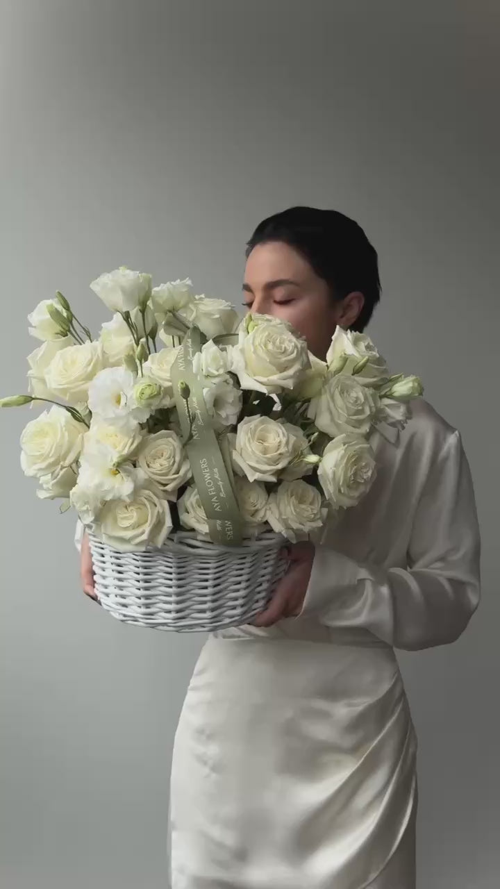 A blooming white basket featuring lush white hydrangeas, pearl-toned garden roses, and delicate lisianthus. Soft, refined, and timeless — designed to elevate any moment with effortless elegance.