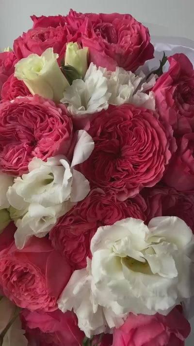 A delicate bouquet of garden pink roses paired with soft white lisianthus. Sweet, refined, and effortlessly elegant — a graceful expression of modern romance.