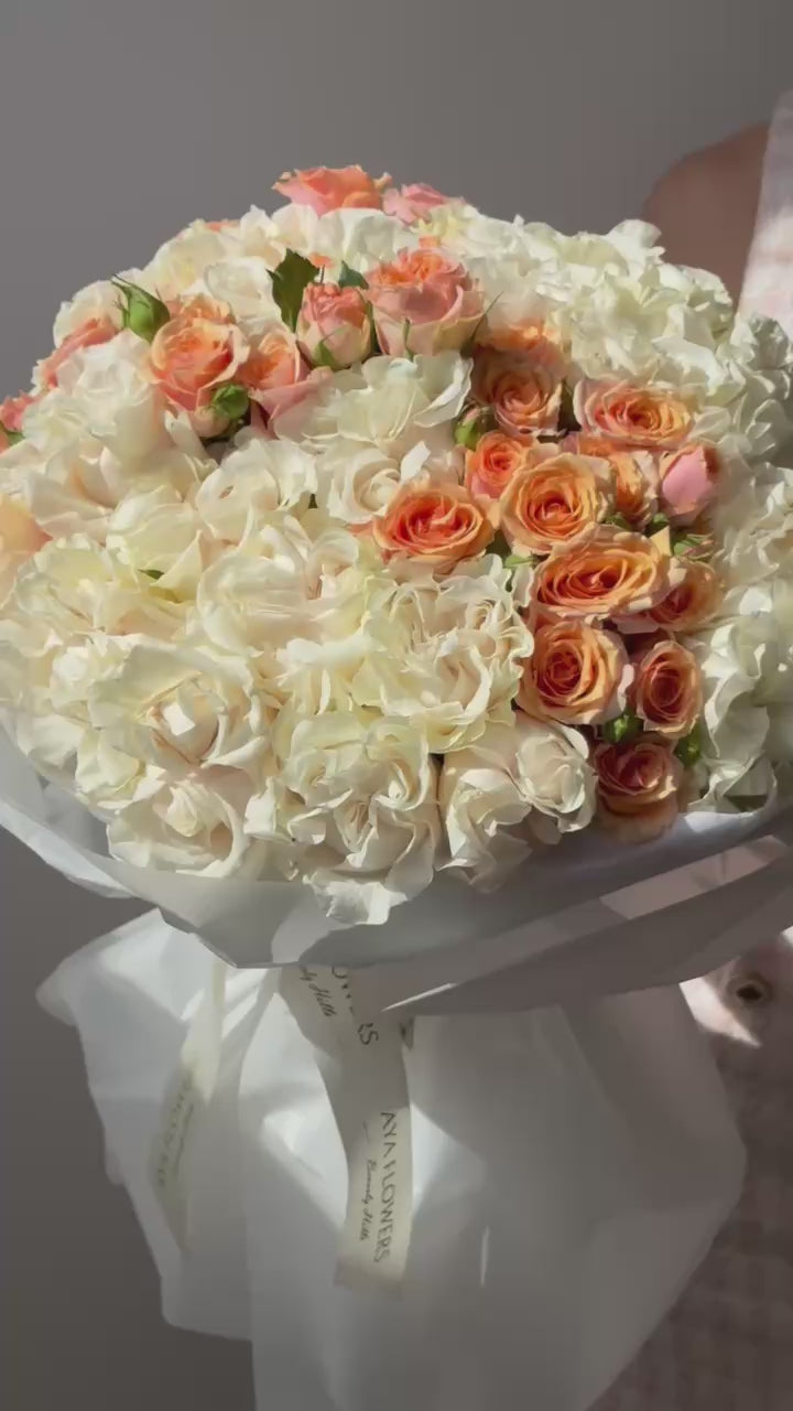 An elegant bouquet inspired by the warm hues of the Tuscan city of Siena. Featuring exclusive white garden roses with a unique ruffled texture, paired with delicate spray roses in soft orange. A refined and radiant composition that evokes the charm of sunlit Italian streets and timeless beauty. Perfect for those who appreciate subtle luxury and a touch of Mediterranean romance.