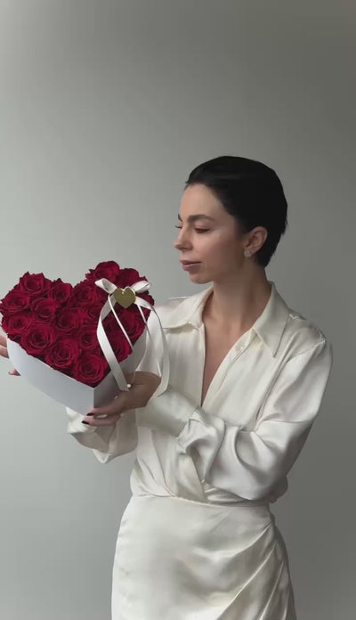 Preserved red roses in a rich, noble shade, arranged in a heart-shaped box — 18 roses in total. Finished with our signature branded heart for the perfect couture touch.