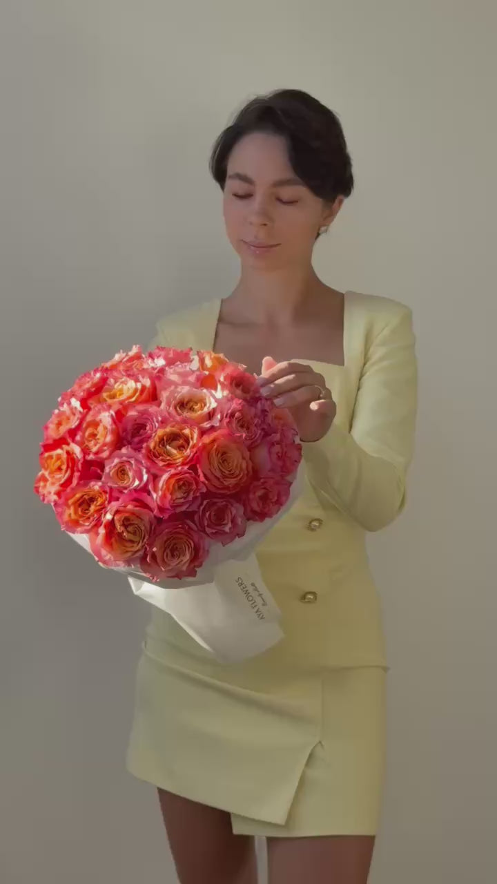 A mono bouquet of garden roses in a unique mix of orange and pink shades, creating a truly eye-catching and elegant look. Like a summer sunset captured in flowers — vibrant, soft, and unforgettable.
