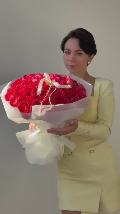 Fifty scarlet garden roses of an exquisite, noble shade arranged in our signature white classic wrapping. The bouquet is adorned with the exclusive AYA Flowers heart décor, creating an unforgettable symbol of love and elegance.