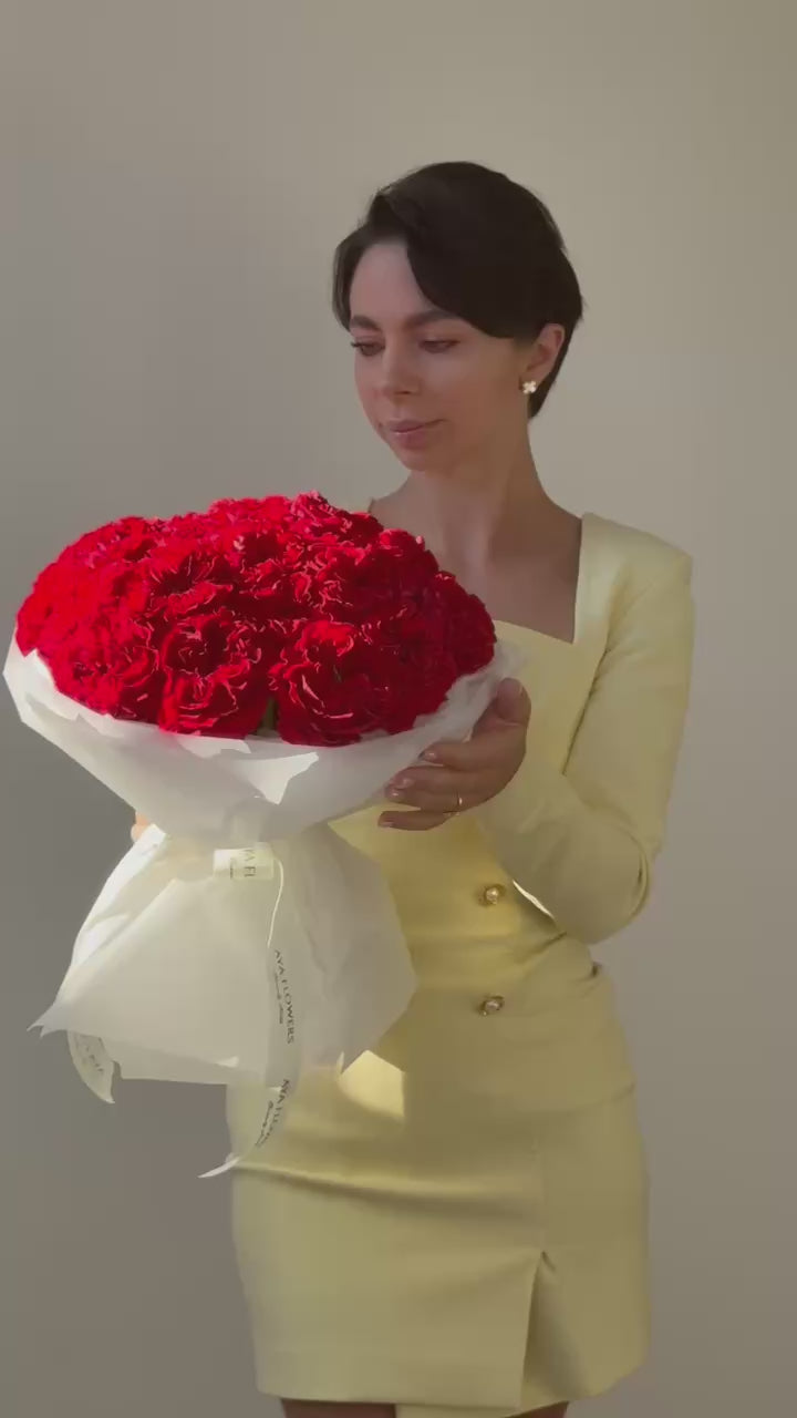 A stunning bouquet of 25 unique red garden roses with a vibrant green heart — a bold and elegant statement. A perfect fusion of timeless classic and modern sophistication, created to impress at first sight.